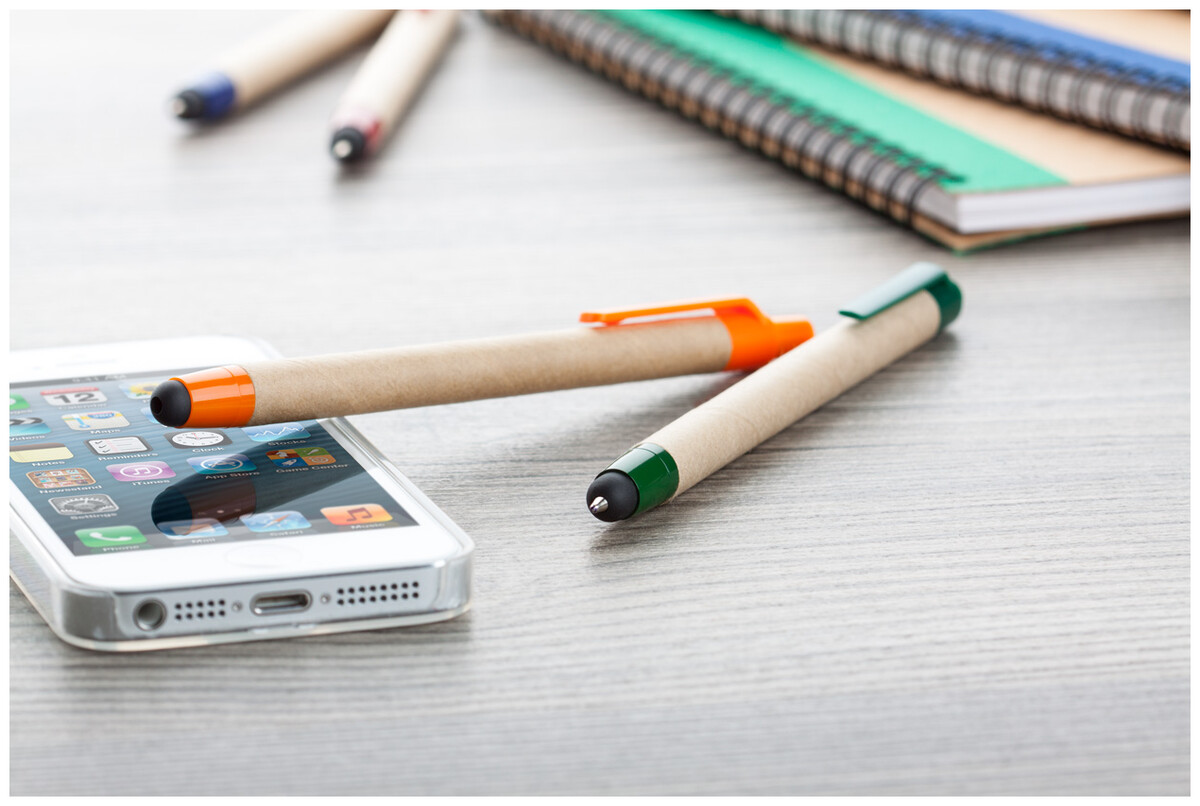 Kuličkové pero z recyklovaného papíru s dotykovým perem s barevnou špičkou a klipem, s modrou náplní.