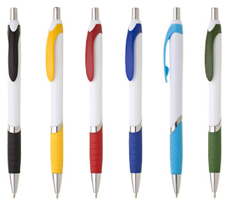 Plastová propiska s bílým tělem tyrkysovým úchopem a klipem a stříbrnými doplňky.