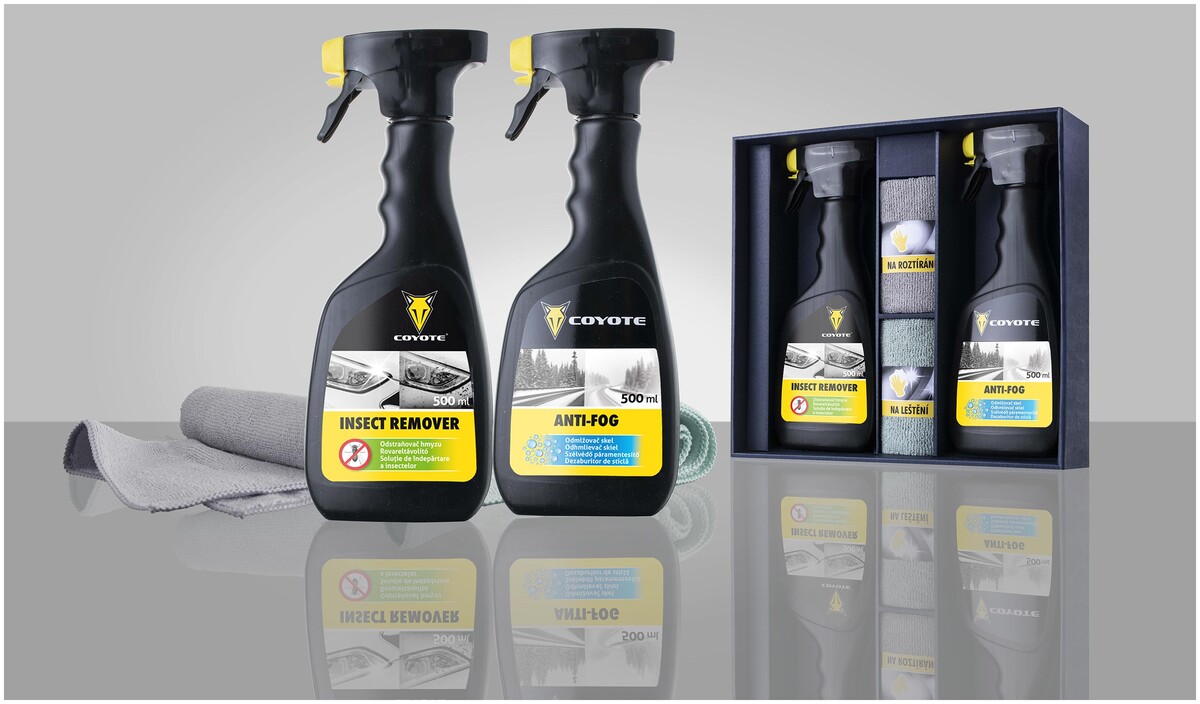 Coyote odmlžovač skel MR 500 ml, Coyote odstraňovač hmyzu MR 500 ml, utěrka mikrovlákno 30x30 cm - 2 ks