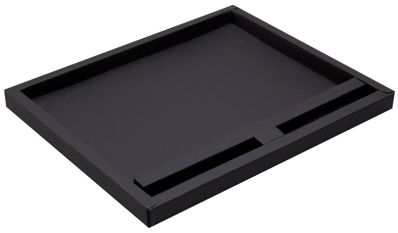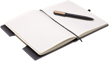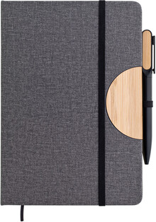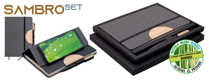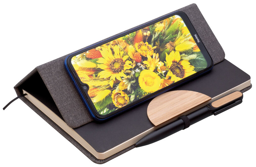 Poznámkový blok, zápisník v textilních deskách, které lze použít jako stojánek na mobil. V černé dárkové krabičce s otočnou propiskou s bambusovou vsadkou.