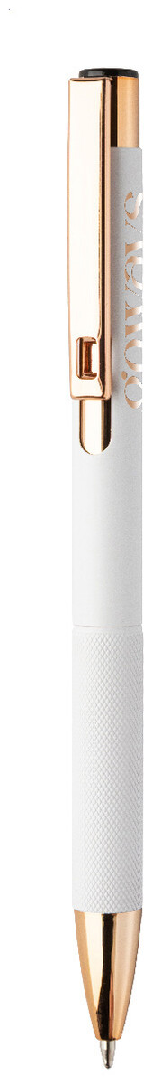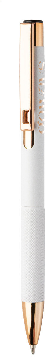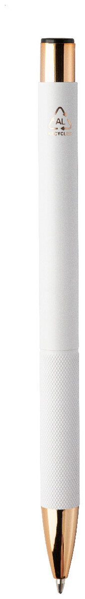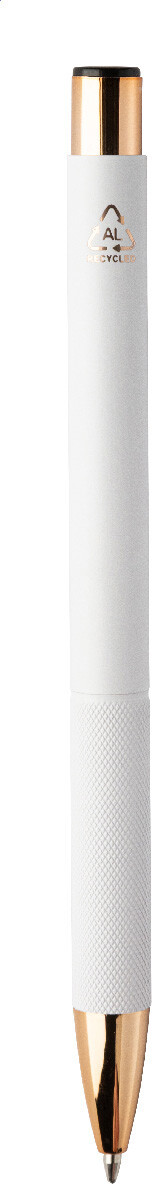 Kuličkové pero z recyklovaného hliníku s matným tělem, texturovaným úchopem a detaily růžového zlata. Se speciálním povrchem pro zrcadlové laserové gravírování v barvě růžového zlata. S modrou náplní.