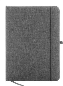Blok A5 potažený polyesterem 300D RPET s 80 čistými listy. S gumovým páskem, záložkou a držákem na pero.
