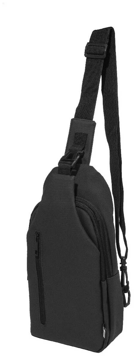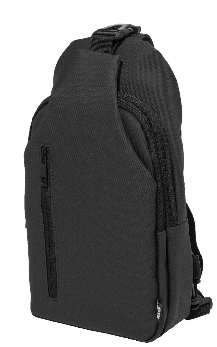 Voděodolná RPET crossbody taška na zavěšení přes rameno s kapsami na zip, zapínáním na přezku a polstrovanými zády. S nastavitelným ramenním popruhem vybaveným polohami na levé a pravé straně. Polyester RPET 600D potažený PU, s výraznou etiketou RPET.