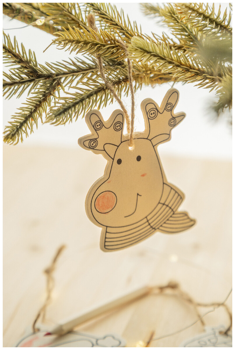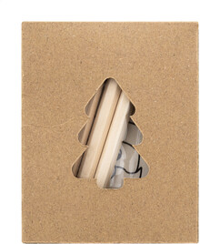 Sada vánočních ozdob na vybarvení v krabičce z kraftového papíru s vyřezávaným vánočním stromečkem. Včetně 3 dřevěných ozdob s konopnou šňůrou a 4 barevných tužek.