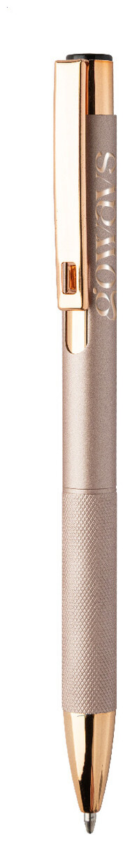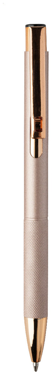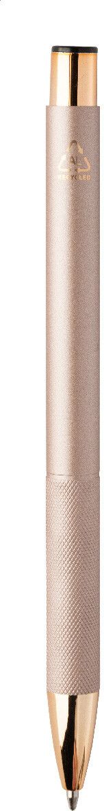 Kuličkové pero z recyklovaného hliníku s matným tělem, texturovaným úchopem a detaily růžového zlata. Se speciálním povrchem pro zrcadlové laserové gravírování v barvě růžového zlata. S modrou náplní.
