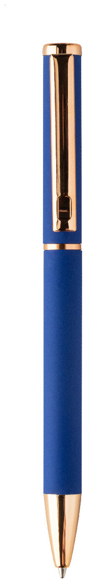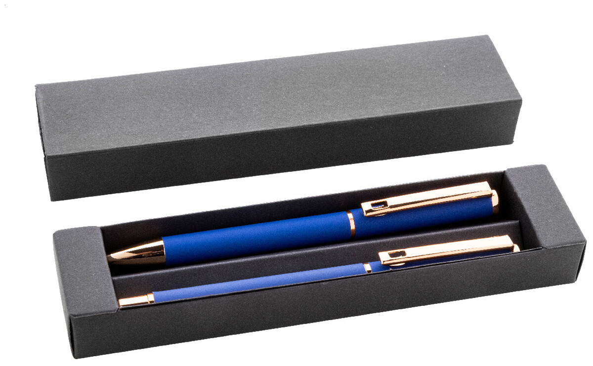 Sada per z recyklovaného hliníku s kuličkovým perem a rollerem s pogumovaným povrchem a detaily růžového zlata. S modrou náplní. Se speciálním povrchem pro zrcadlové laserové gravírování v růžovo-zlaté barvě. V černé papírové dárkové krabičce.