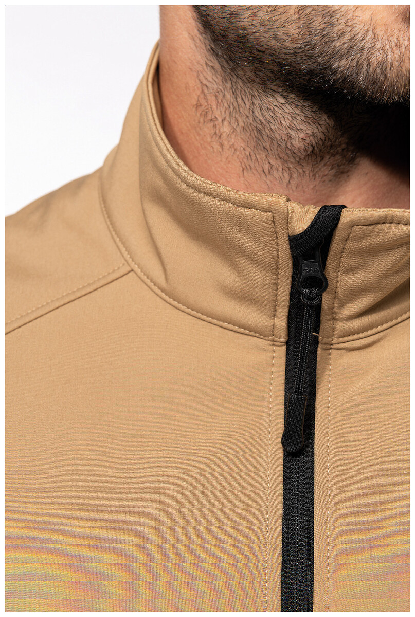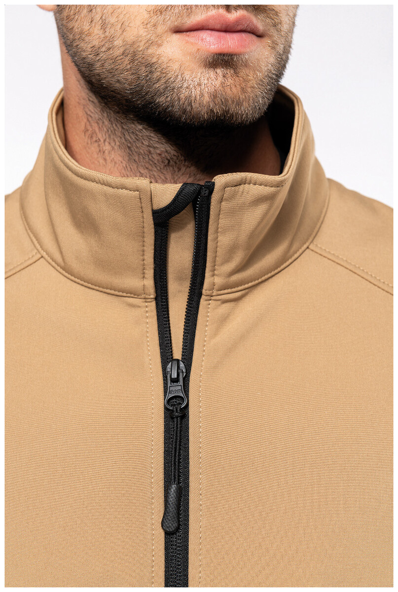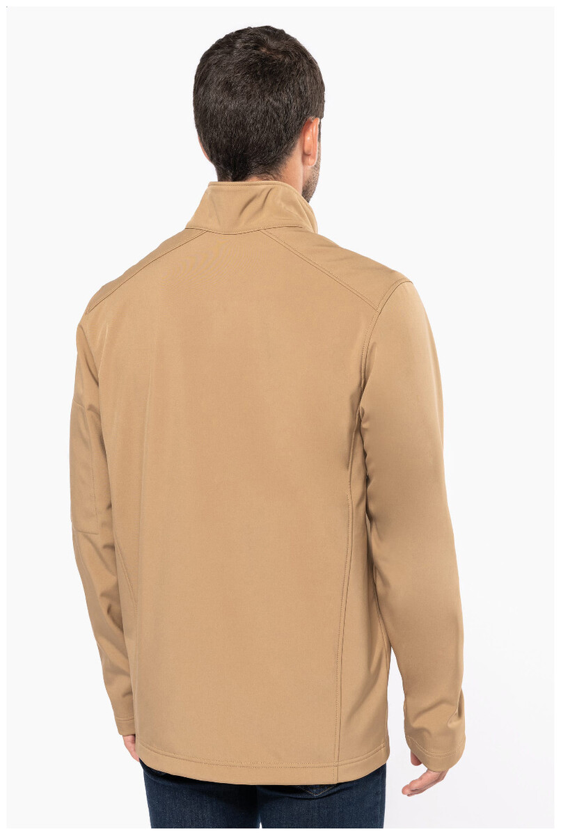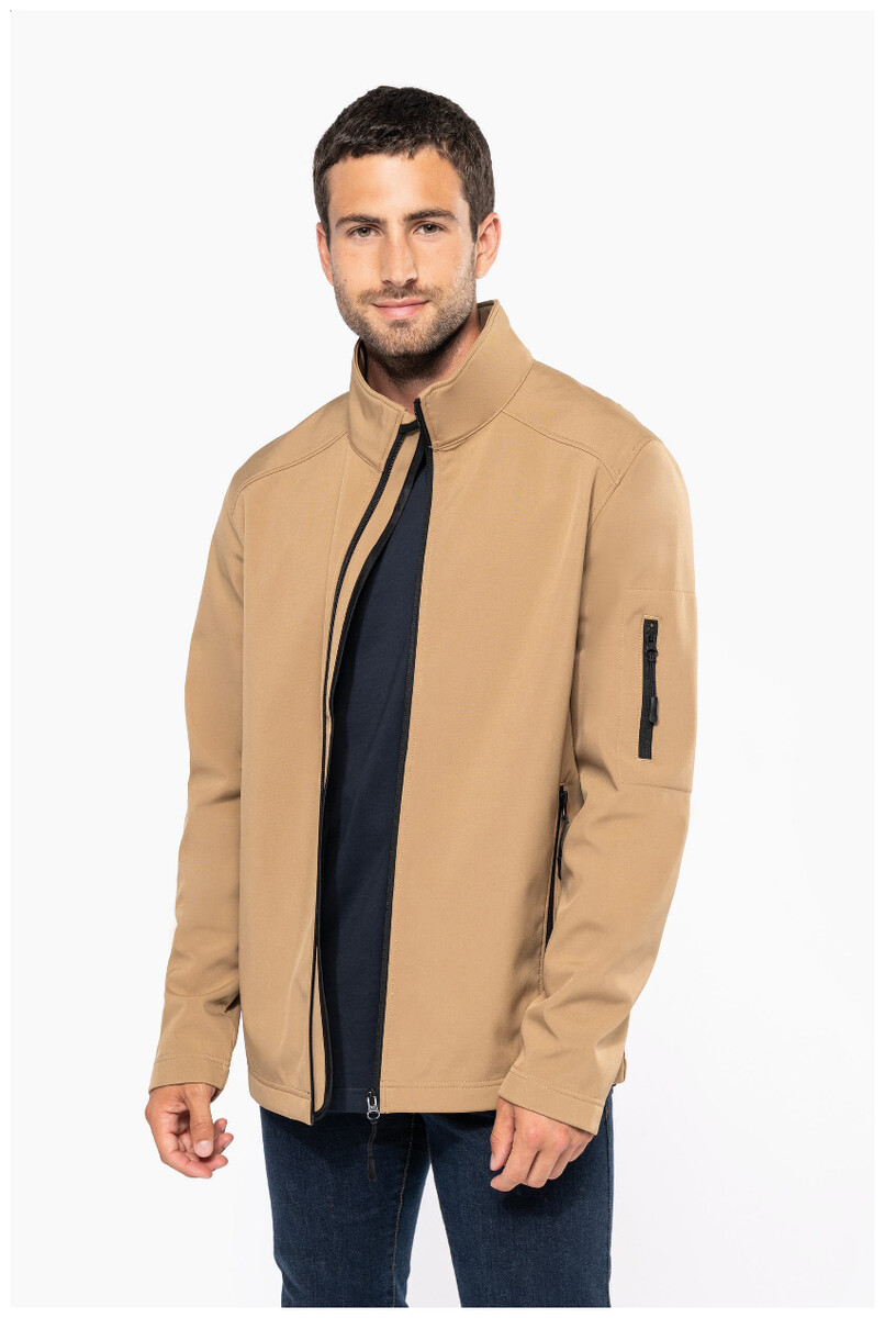 Třívrstvá, prodyšná, větru a vodě odolná softshellová bunda na zip s rukávy na zip a bočními kapsami. S prodyšnou střední vrstvou a vnitřní vrstvou z mikropolaru. Materiál: 95 % polyester a 5 % elastan, 300 g/m2. Výrobek značky Kariban.