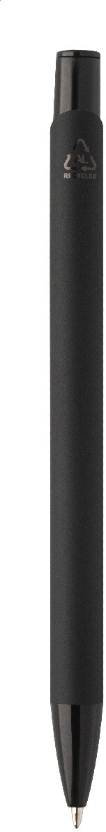 Kuličkové pero z recyklovaného hliníku s pogumovaným tělem a barevnými lesklými kovovými díly. Se speciálním povrchem pro zrcadlové gravírování, které odpovídá kovovým částem. S modrou náplní.