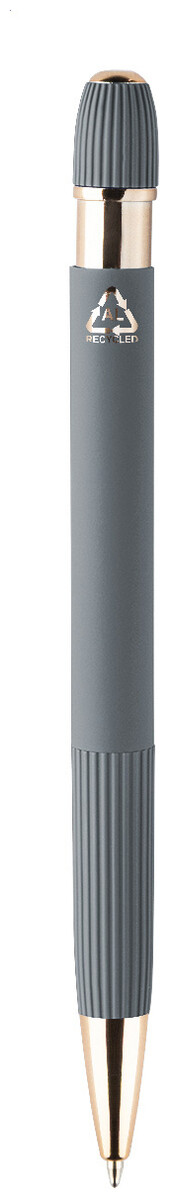 Kuličkové pero z recyklovaného hliníku s pogumovaným tělem a detaily v růžovo-zlaté barvě. Se speciálním povlakem pro zrcadlové laserové gravírování v růžovo-zlaté barvě. S modrou náplní.
