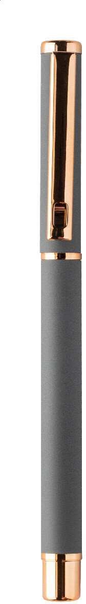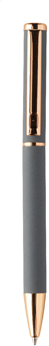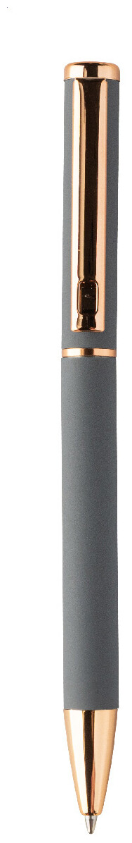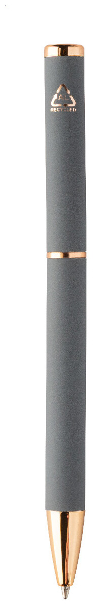 Sada per z recyklovaného hliníku s kuličkovým perem a rollerem s pogumovaným povrchem a detaily růžového zlata. S modrou náplní. Se speciálním povrchem pro zrcadlové laserové gravírování v růžovo-zlaté barvě. V černé papírové dárkové krabičce.
