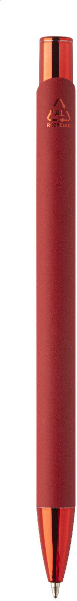 Kuličkové pero z recyklovaného hliníku s pogumovaným tělem a barevnými lesklými kovovými díly. Se speciálním povrchem pro zrcadlové gravírování, které odpovídá kovovým částem. S modrou náplní.