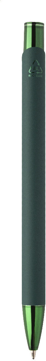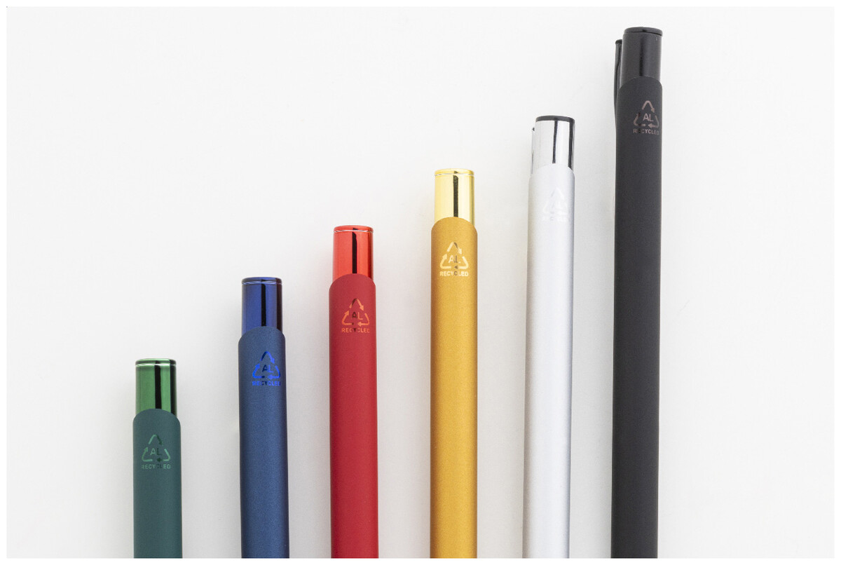 Kuličkové pero z recyklovaného hliníku s pogumovaným tělem a barevnými lesklými kovovými díly. Se speciálním povrchem pro zrcadlové gravírování, které odpovídá kovovým částem. S modrou náplní.