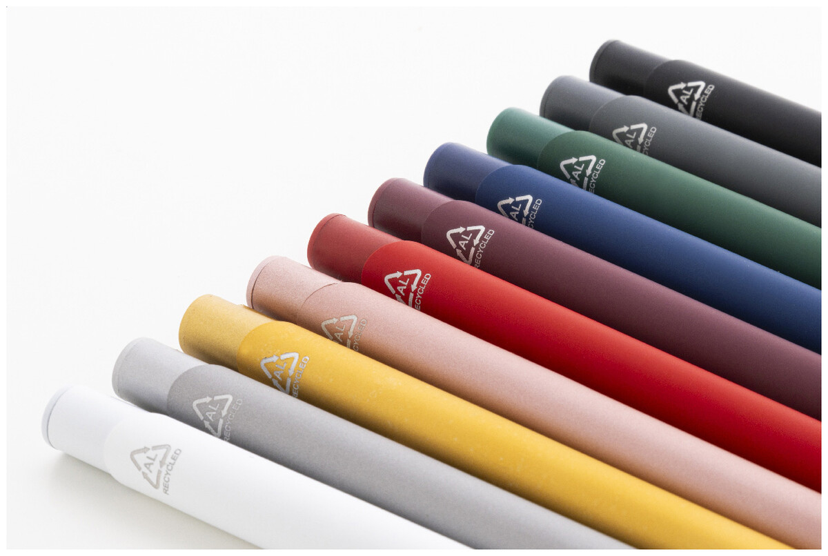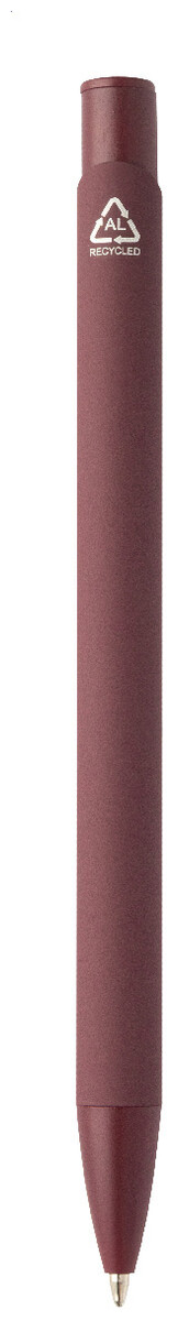 Kuličkové pero z recyklovaného hliníku s pogumovaným tělem a barevnými lesklými kovovými díly. Se speciálním povrchem pro zrcadlové gravírování, které odpovídá kovovým částem. S modrou náplní.