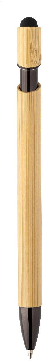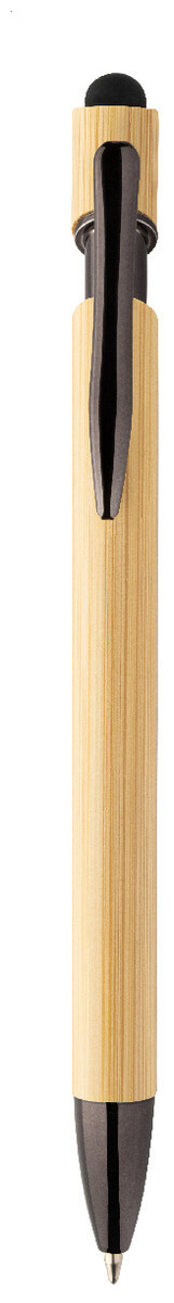 Bambusové dotykové kuličkové pero s lesklými kovovými detaily a barevným dotykovým stylusem. S modrou náplní.