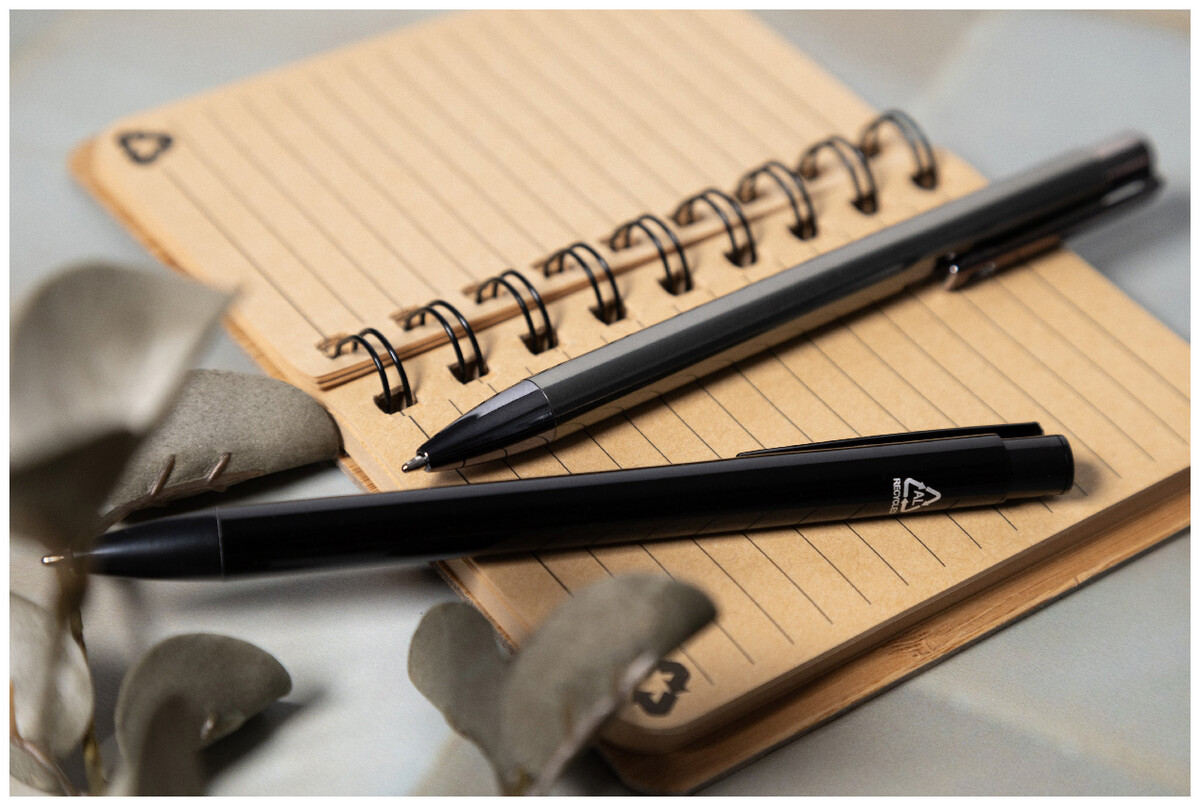 Kuličkové pero z recyklovaného hliníku s lesklým kovovým povrchem. S modrou náplní.