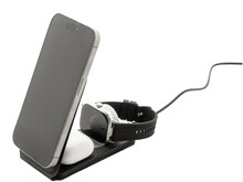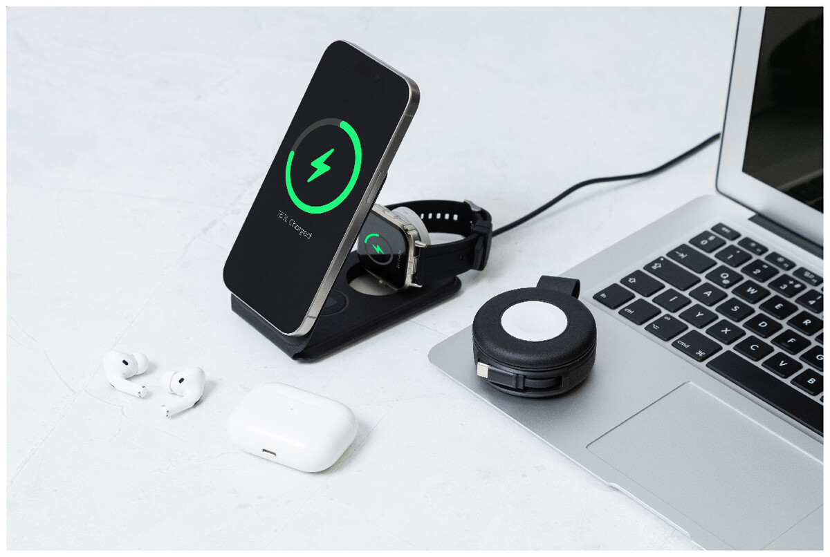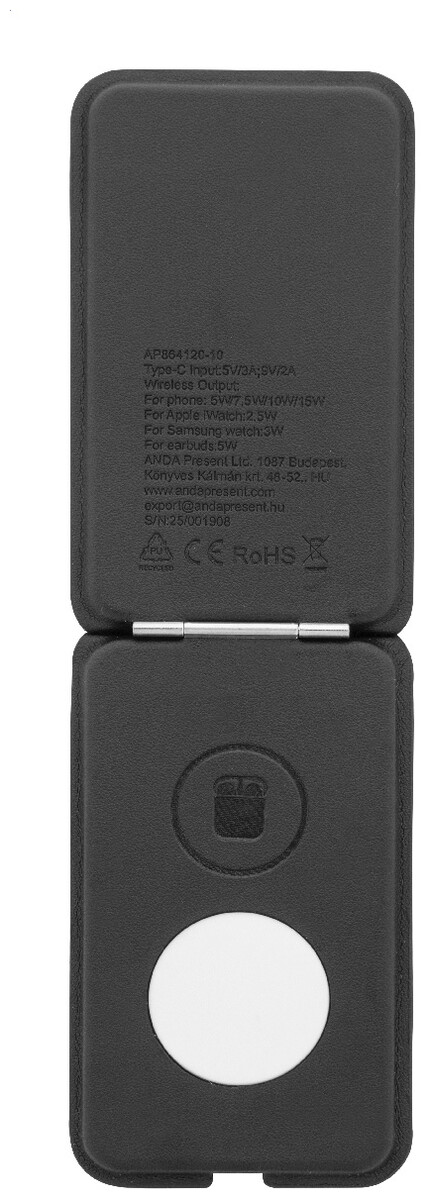 Luxusní skládací držák na mobilní telefon a bezdrátová nabíjecí sada z recyklované PU kůže. S magnetickou bezdrátovou rychlonabíječkou (15 W), bezdrátovou nabíječkou (5 W) pro sluchátka (pouze Apple®) a bezdrátovou nabíječkou (2,5 W) pro chytré hodinky (Apple® a Samsung®). Včetně samolepicího kovového kroužku pro použití magnetické funkce na jakémkoli bezdrátově nabíjecím zařízení. Kompatibilní s iPhone® 12 nebo novějším. Včetně USB nabíjecího kabelu.