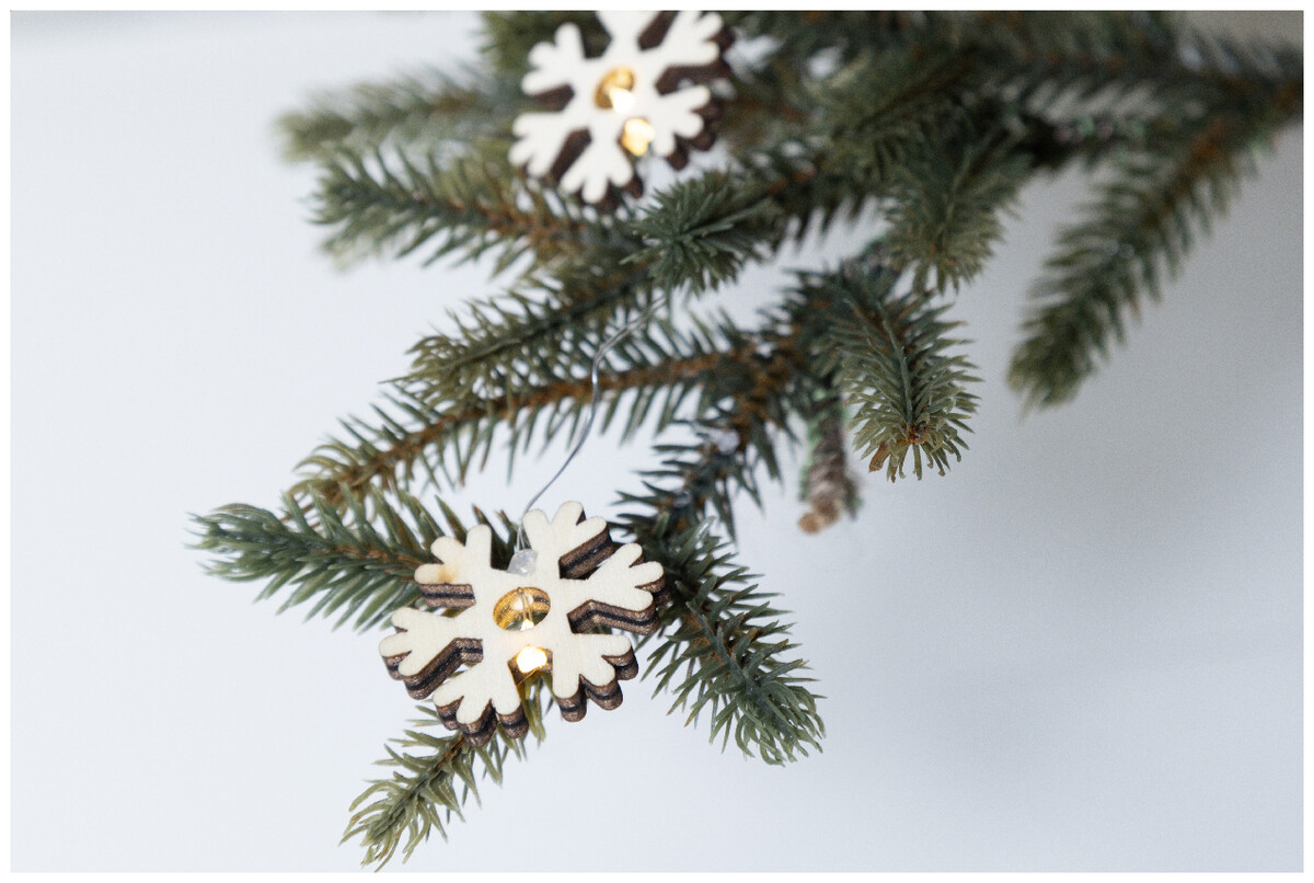 Vánoční světelná dekorace s 20 LED světly ve tvaru dřevěné sněhové vločky. Funguje na 2 AA baterie, bez baterií. S tlačítkem ZAP/VYP na pouzdře na baterie. V krabičce z kraftového papíru.