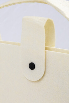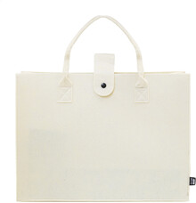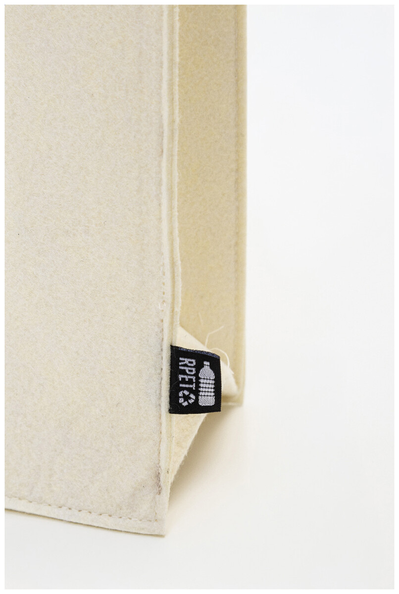 Nákupní taška z RPET plsti s klínkem, zapínáním na knoflíky a krátkými uchy. S výraznou etiketou z RPET.