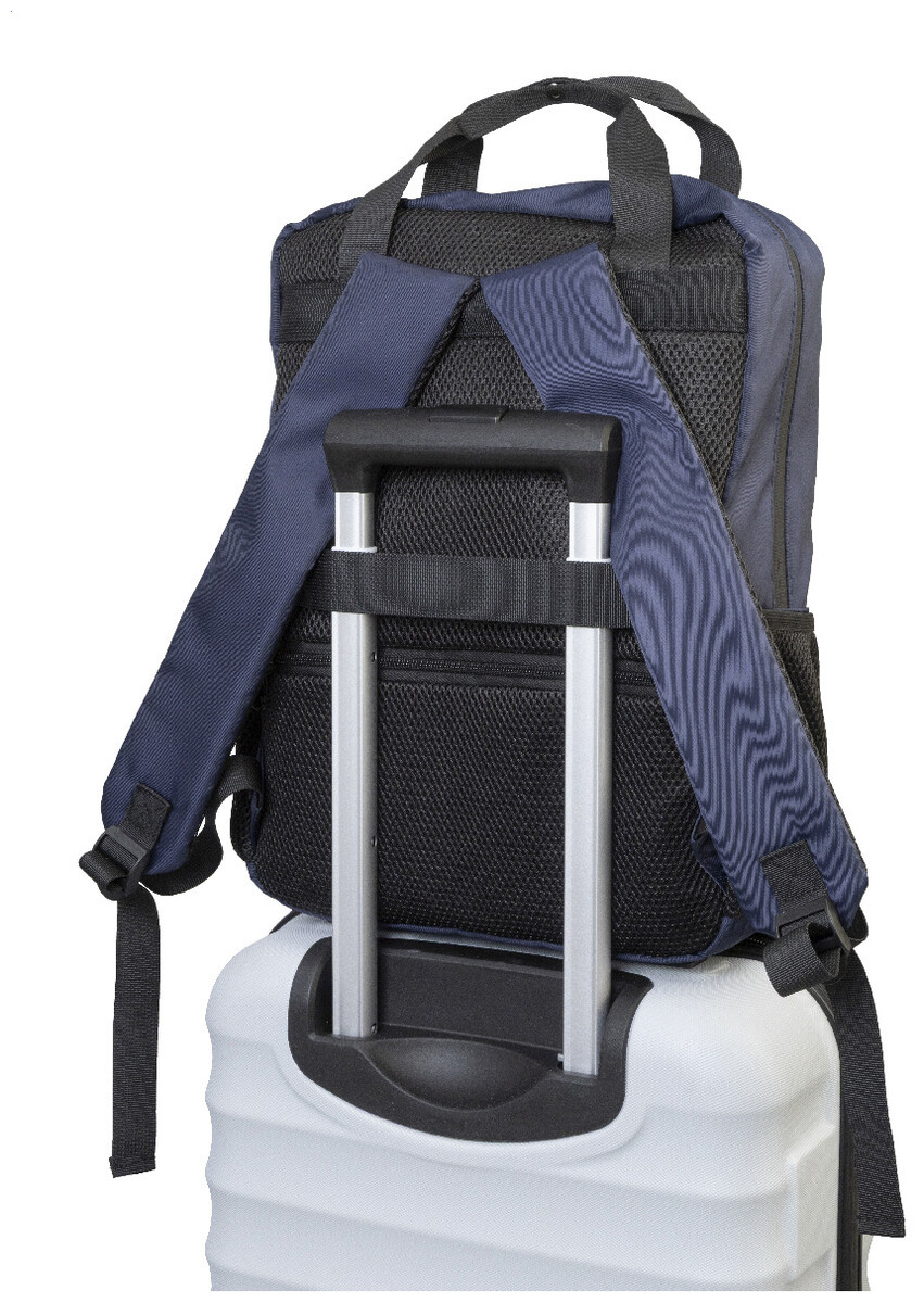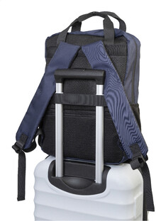 Batoh z RPET s přihrádkou na zip, 2 předními kapsami na zip, polstrovanou přihrádkou na notebook (15") a bočními síťovanými kapsami. S polstrovanými zády a ramenními popruhy, kapsou proti krádeži a popruhem na kolečkách. RPET keprový polyester s výrazným štítkem RPET.