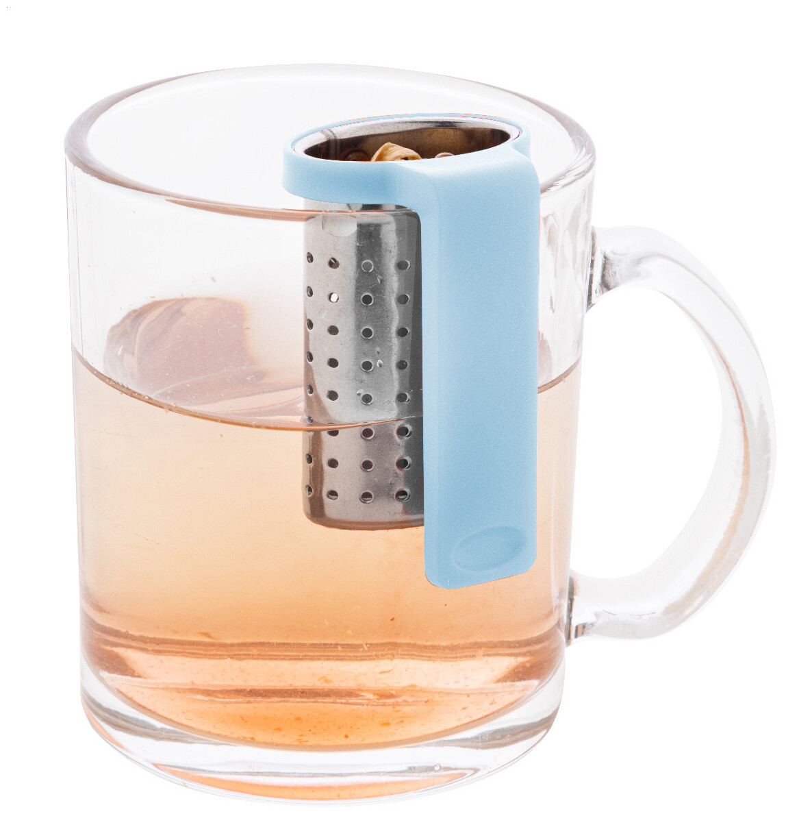 Nerezové sítko na čaj s praktickým klipem z recyklovaného ABS plastu. Navržen pro snadné připevnění k okraji hrnku.