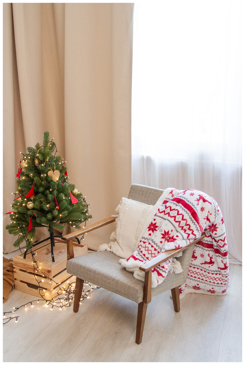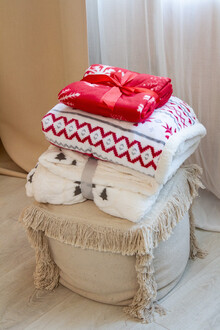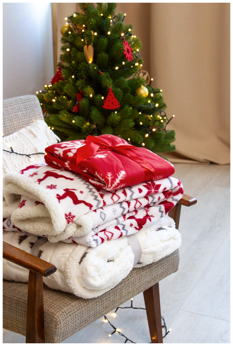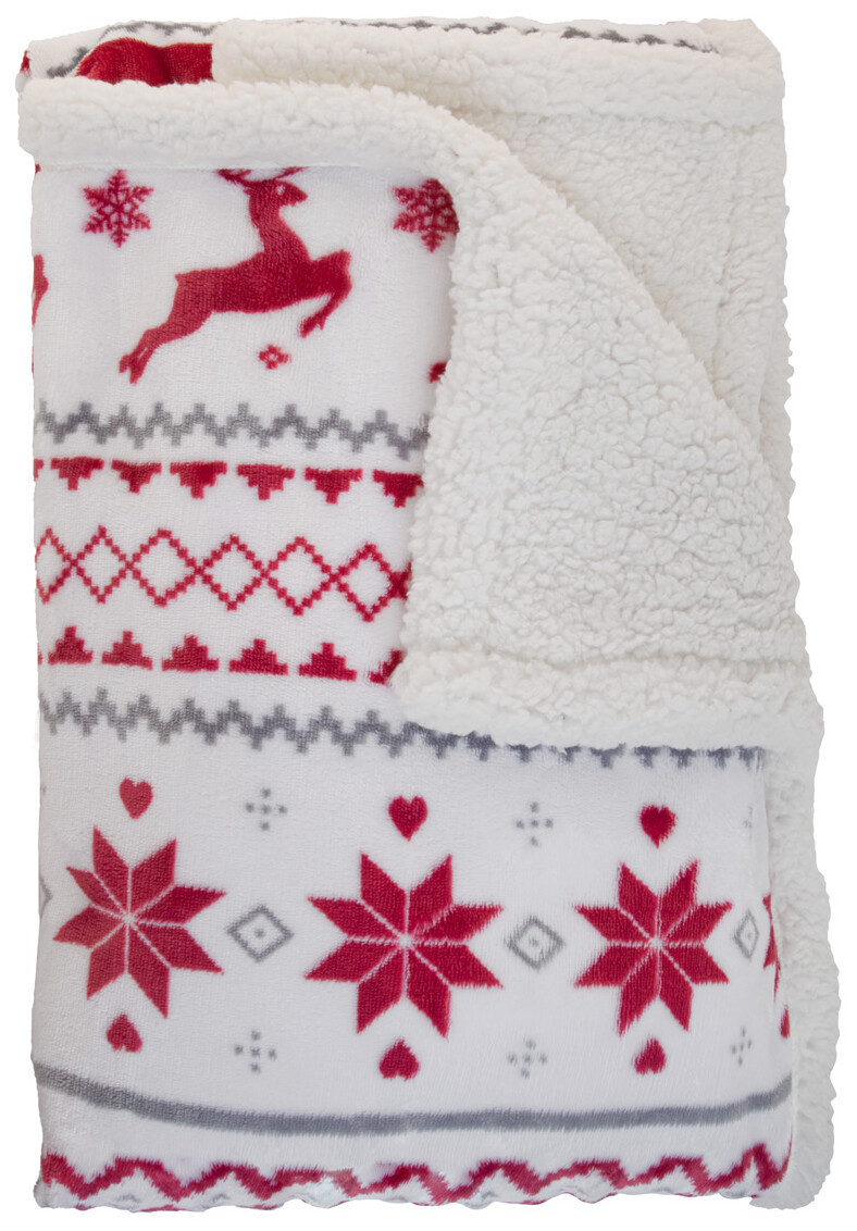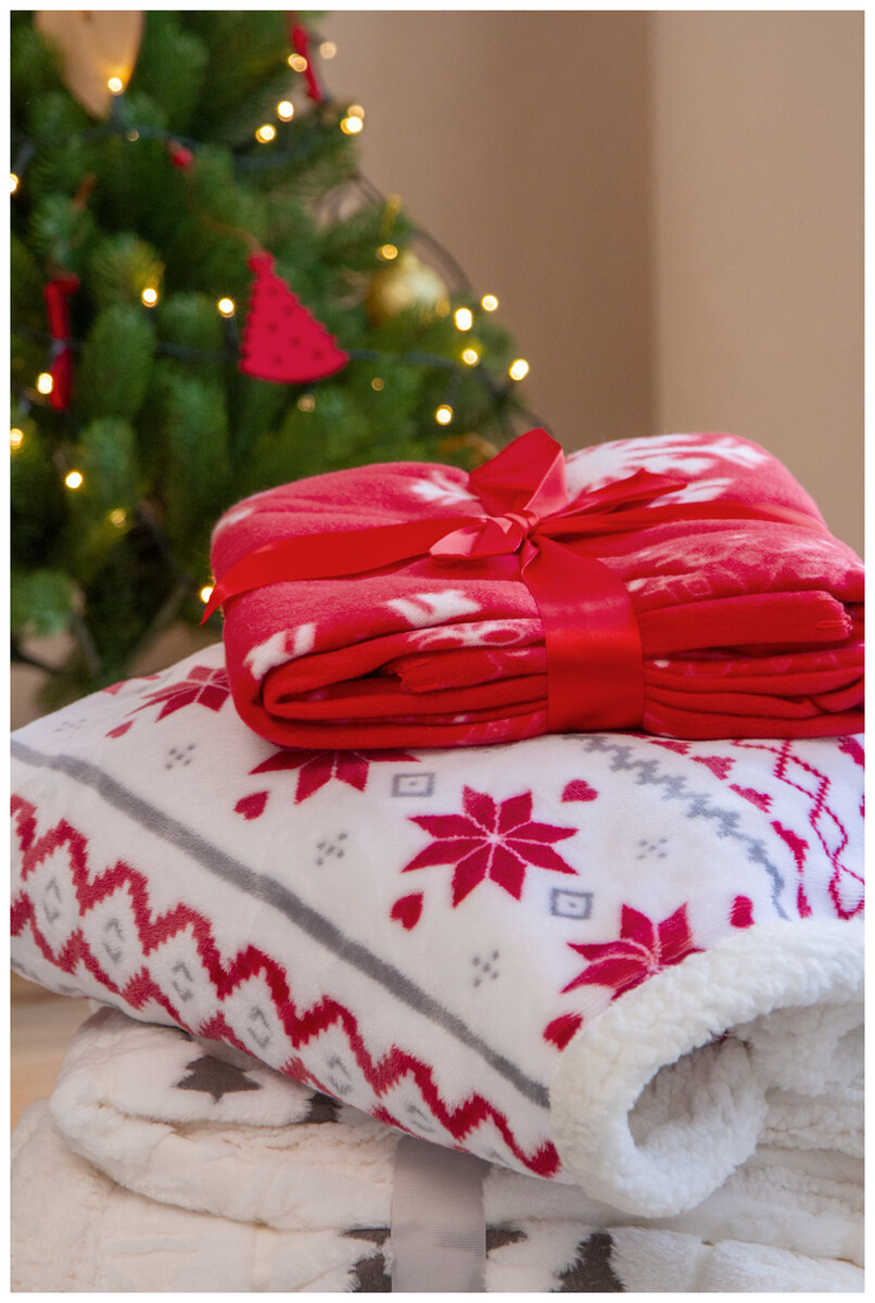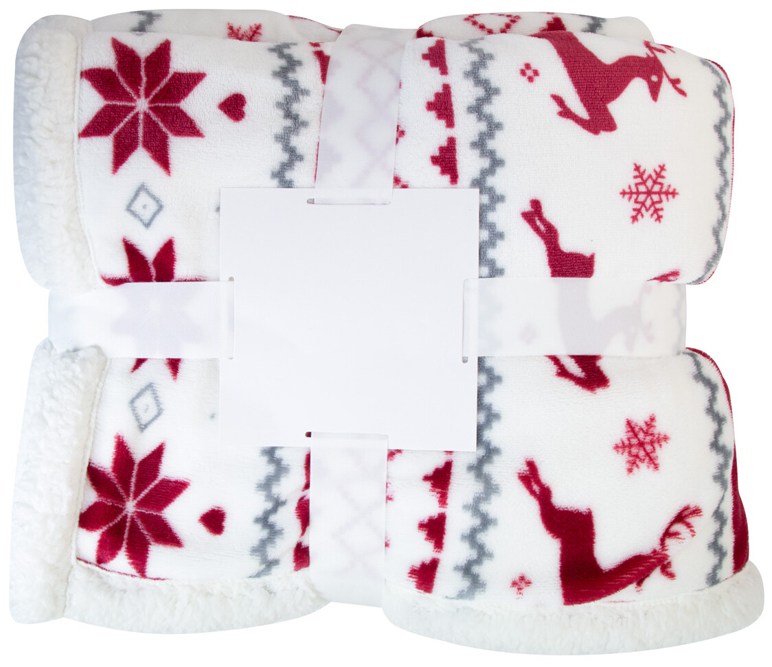 Dvouvrstvá vánoční deka ze 230 g/m2 flanelového fleecu RPET a oboustrannou podšívkou z RPET sherpa fleecu 210 g/m2. Zabalené do stuhy a potisknutelné papírové karty.