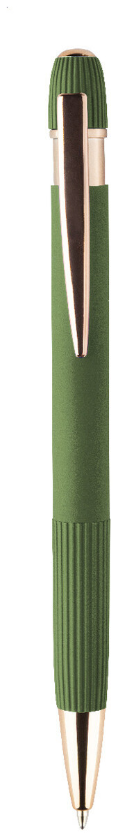 Kuličkové pero z recyklovaného hliníku s pogumovaným tělem a detaily v růžovo-zlaté barvě. Se speciálním povlakem pro zrcadlové laserové gravírování v růžovo-zlaté barvě. S modrou náplní.
