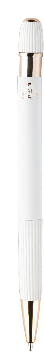 Kuličkové pero z recyklovaného hliníku s pogumovaným tělem a detaily v růžovo-zlaté barvě. Se speciálním povlakem pro zrcadlové laserové gravírování v růžovo-zlaté barvě. S modrou náplní.