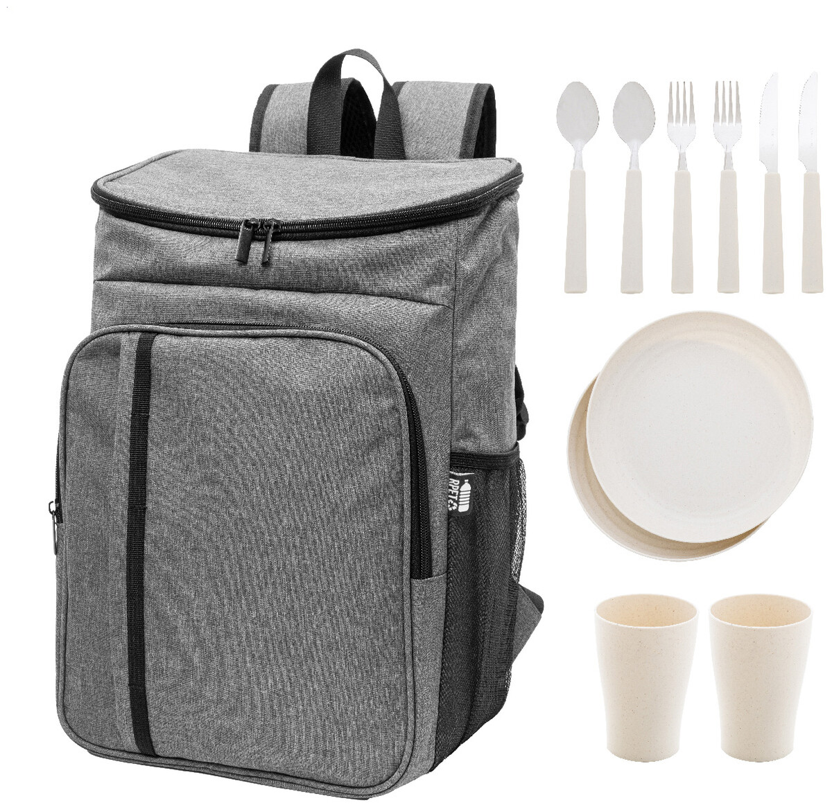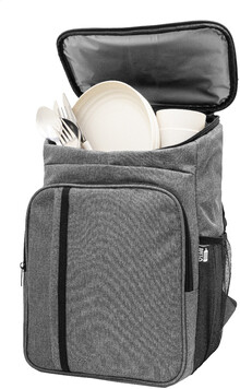 Chladicí piknikový batoh z RPET s přední kapsou na zip a chladicí přihrádkou na zip s PEVA výplní. S bočními síťovanými kapsami, polstrovanými zády a ramenními popruhy. Včetně nádobí z PP a nerezové oceli pro 2 osoby: 2 talíře, 2 hrnky, 2 vidličky, 2 lžíce a 2 nože. 600D RPET polyester s výrazným štítkem RPET.