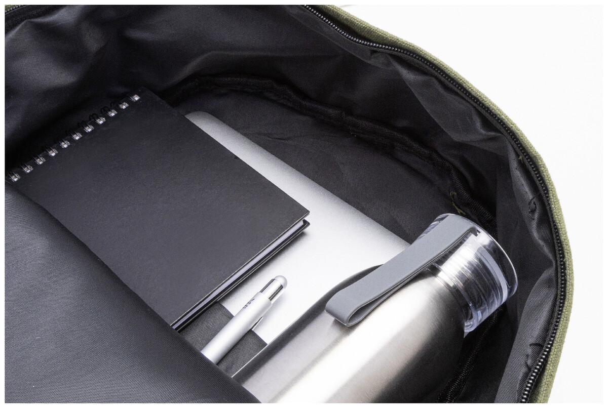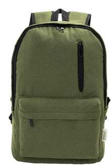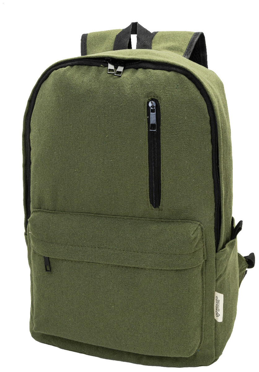 Recyklovaný plátěný batoh s hlavní přihrádkou na zip, polstrovanou přihrádkou na notebook (15"), 2 předními kapsami na zip, bočními kapsami, popruhem na kolečkách, polstrovanými zády a ramenními popruhy. 70% recyklované bavlny a 30% RPET polyesteru. S výrazným štítkem recyklované bavlny.