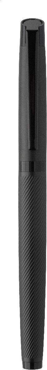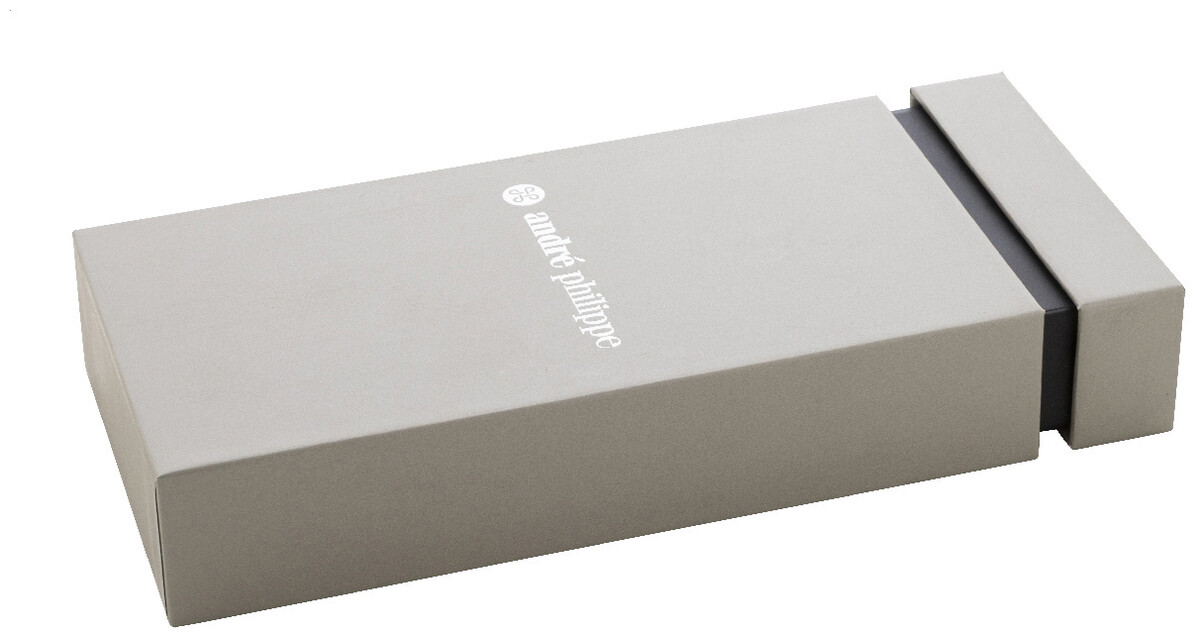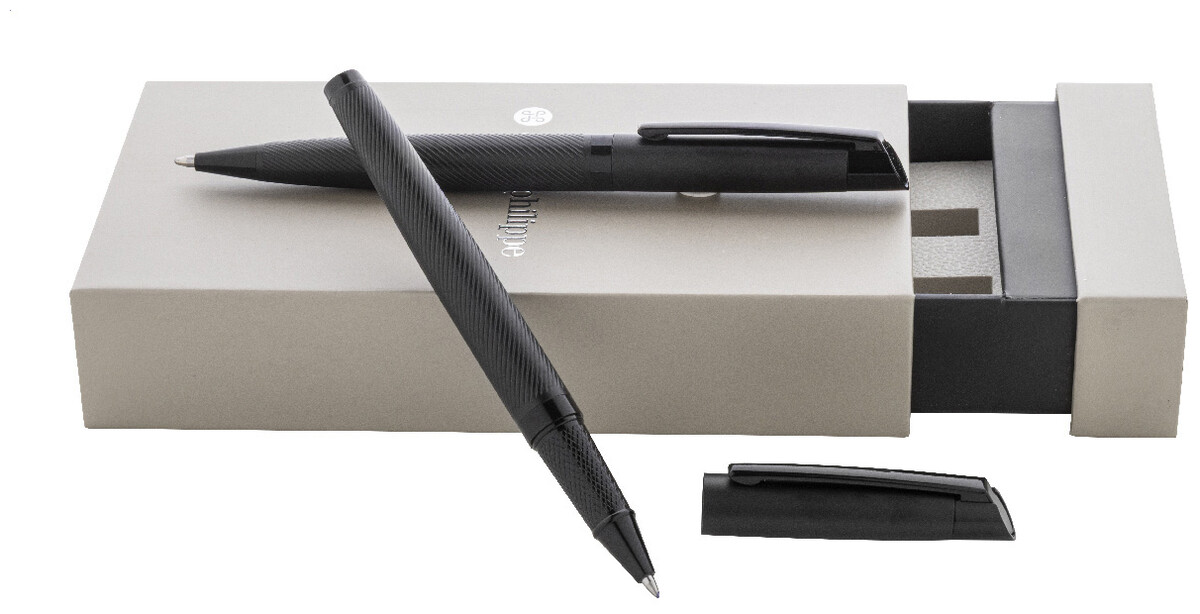 Elegantní sada kovového kuličkového pera a rolleru s diagonálně texturovaným tělem. Ve dvoubarevné dárkové krabičce s modrou náplní. Produkt značky André Philippe.