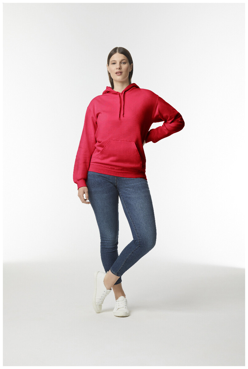 Mikina s kapucí, 80% bavlna a 20% polyester s přední kapsou. 285 g/m2 (bílá 278 g/m2). Značka Gildan.