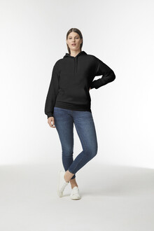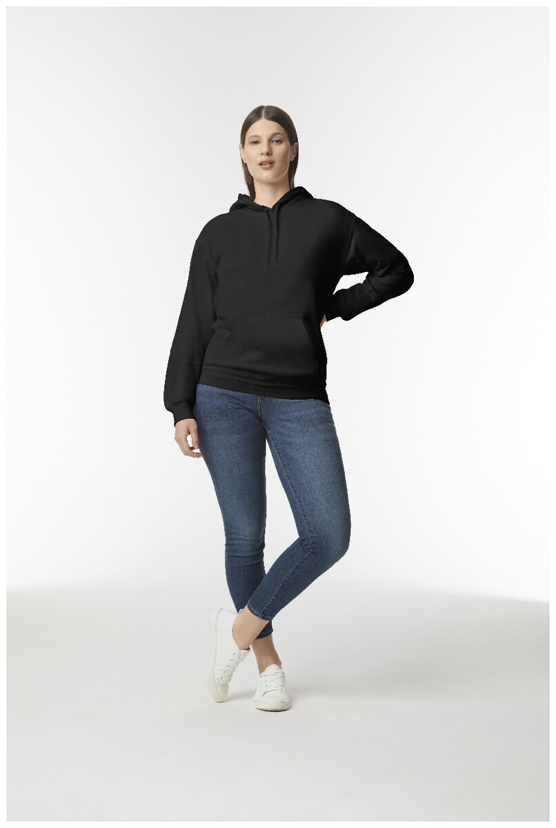 Mikina s kapucí, 80% bavlna a 20% polyester s přední kapsou. 285 g/m2 (bílá 278 g/m2). Značka Gildan.