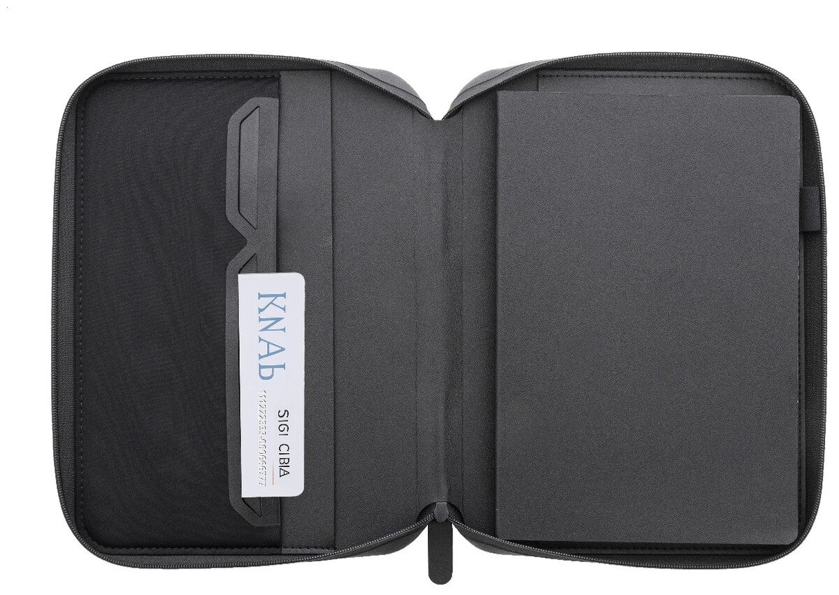 Luxusní složka na dokumenty A5 na zip z recyklované umělé kůže s 64 linkovanými listy a blokem z recyklovaného papíru. S několika vnitřními kapsami na karty a dokumenty.