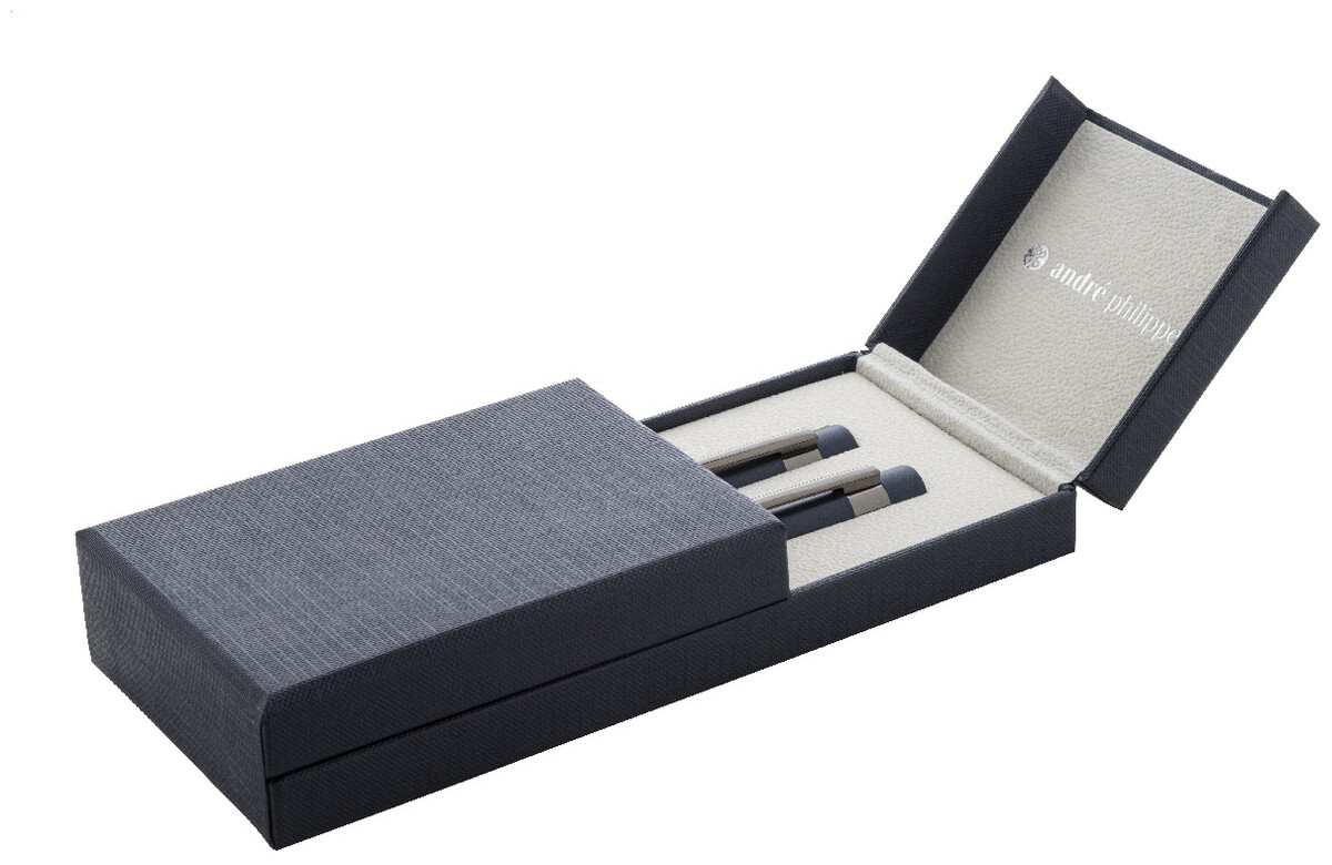 Elegantní sada kovového kuličkového pera a rolleru s lesklými detaily v barvě antracit. V barevně sladěné dárkové krabičce a s modrou náplní. Produkt značky André Philippe.