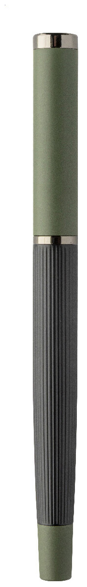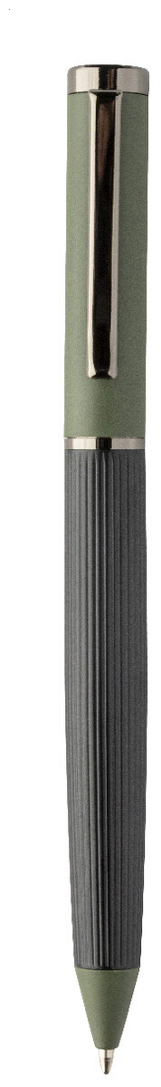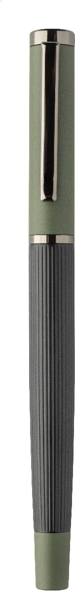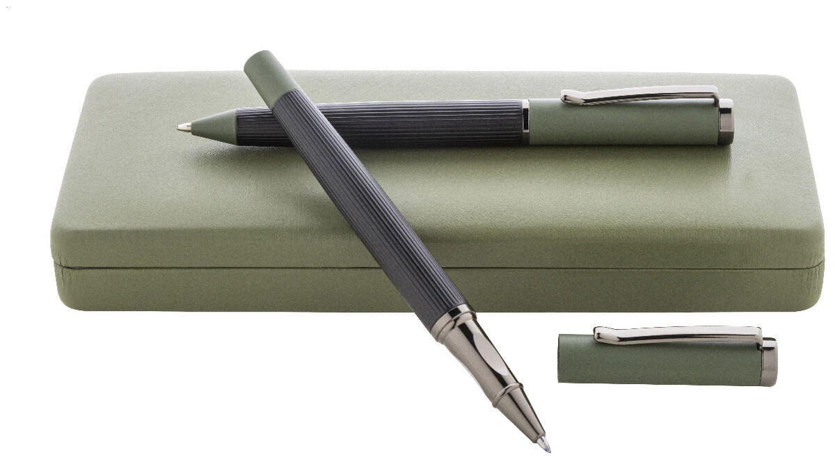 Elegantní sada kovového kuličkového pera a rolleru s pruhovaným tělem, barevnými akcenty a lesklými detaily v barvě antracit. V barevně sladěné dárkové krabičce a s modrou náplní. Produkt značky André Philippe.