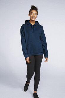 Mikina s kapucí, 80% bavlna a 20% polyester s přední kapsou. 285 g/m2 (bílá 278 g/m2). Značka Gildan.