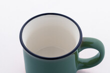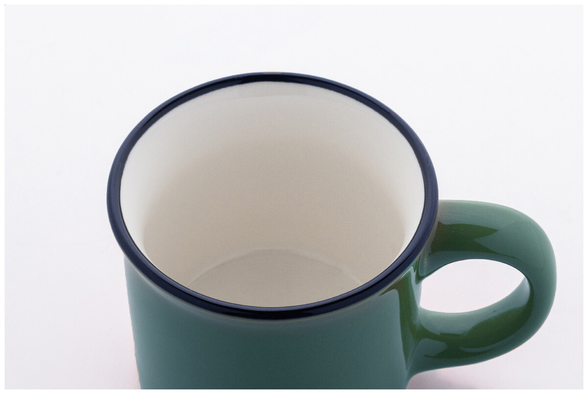 Mini vintage keramický hrnek s černým okrajem, bílým uvnitř a barevným vnějškem, 90 ml. V krabičce z kraftového papíru.