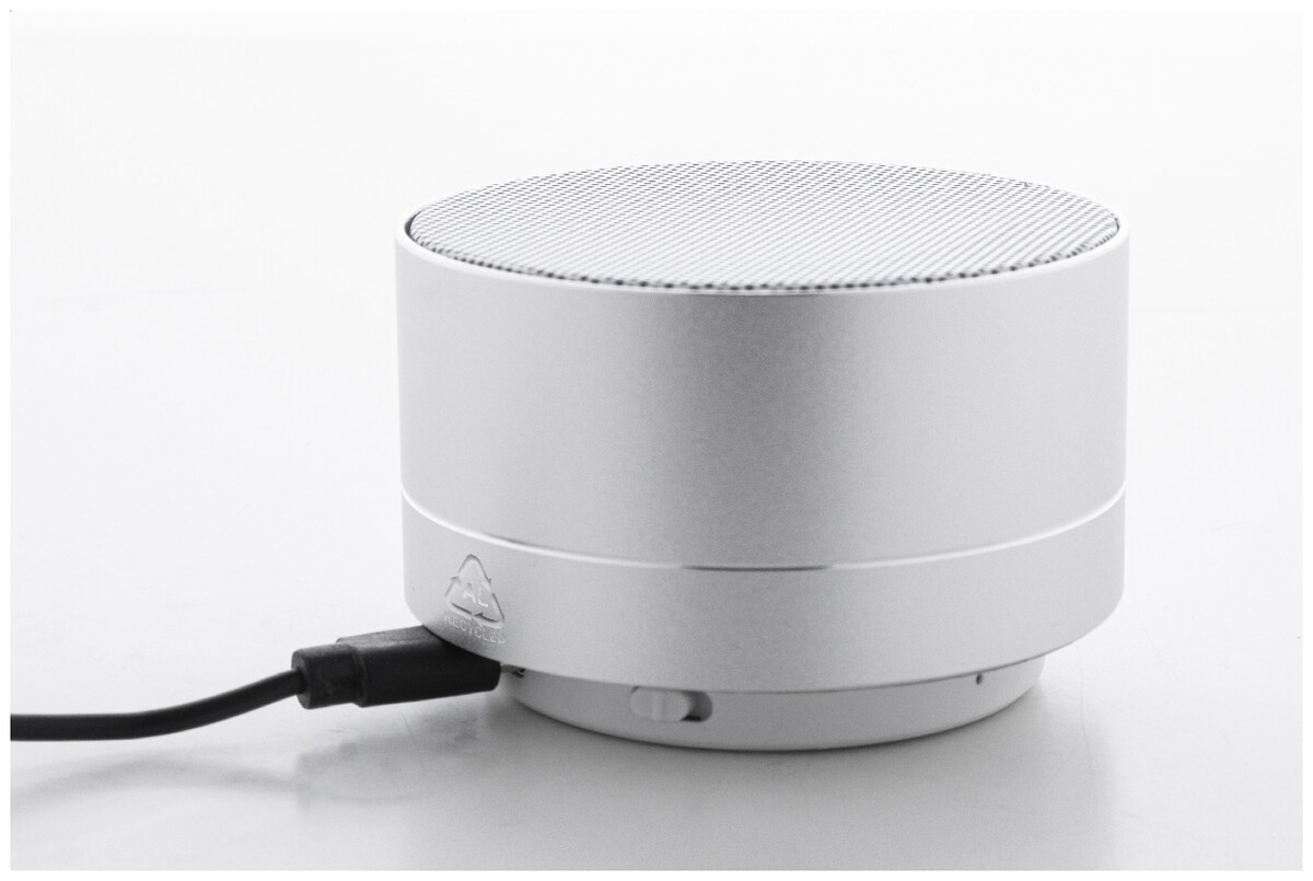 Bezdrátový reproduktor z recyklovaného hliníku s kovovou síťovinou, LED světlem na spodní straně a dobíjecí baterií (300 mAh). S funkcí handsfree hovorů a přehrávání MP3 z micro SD karty. Včetně nabíjecího kabelu USB.