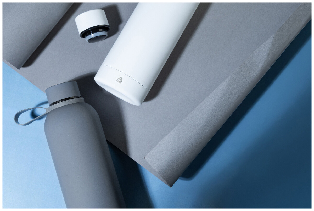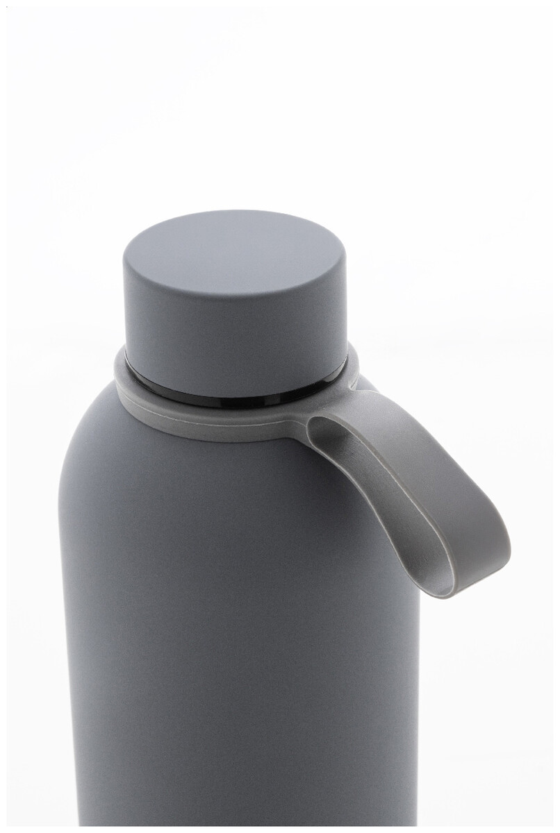 Dvoustěnná vakuová láhev z recyklované nerezové oceli s pogumovanou úpravou a silikonovým páskem, 500 ml.