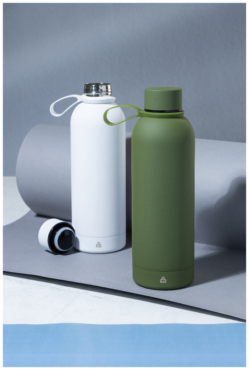Dvoustěnná vakuová láhev z recyklované nerezové oceli s pogumovanou úpravou a silikonovým páskem, 500 ml.