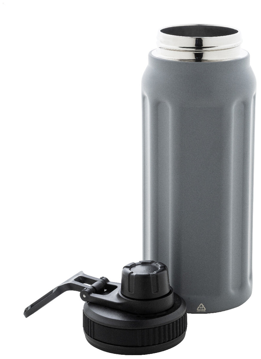 Dvoustěnná termoska z recyklované nerezové oceli s vertikálními drážkami. S víčkem z polypropylenu a s integrovaným držadlem. 540 ml.