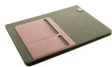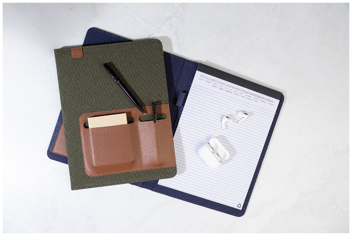 Složka na dokumenty A4 z recyklovaného plátna a recyklované umělé kůže s několika předními a vnitřními kapsami. S blokem na 20 linkovaných listů z recyklovaného papíru. 70 % recyklované bavlny a 30 % RPET polyesteru.