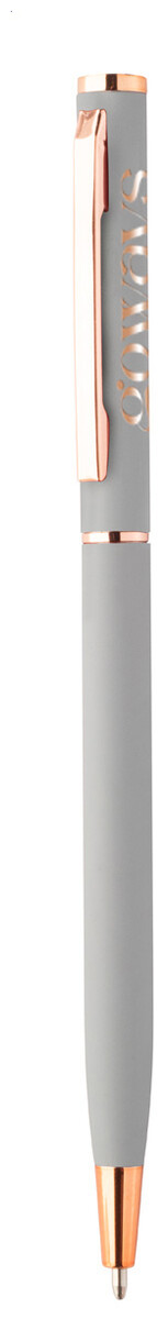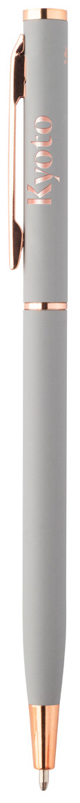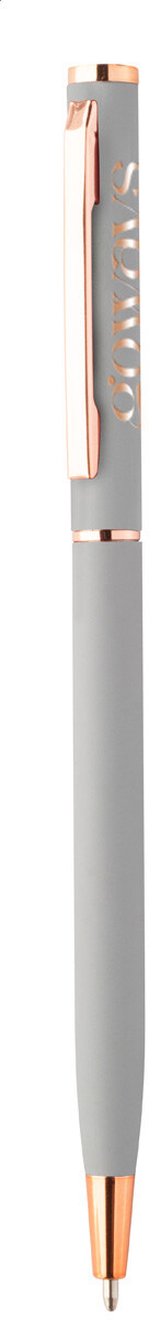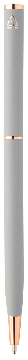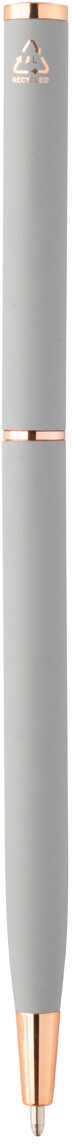 Kuličkové pero z recyklovaného hliníku s pogumovaným povrchem a detaily z růžového zlata. Se speciální povrchovou úpravou pro zrcadlové laserové gravírování v barvě růžového zlata. S modrou náplní.