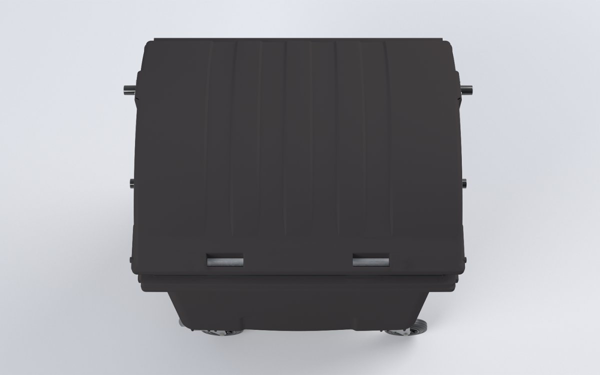 Kontejner s horním výsypem o objemu 1100 litrů je opatřen kulatým víkem.