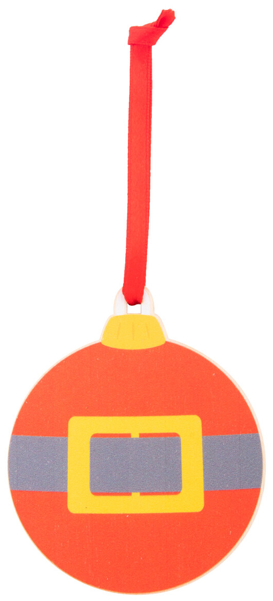 Vánoční ozdoba z březové překližky, s tištěným vánočním designem a červenou stužkou, která je dodávána zvlášť.