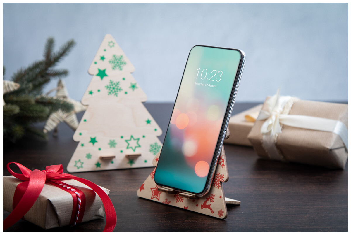 Stojánek na mobil ve tvaru vánočního stromku z březové překližky. Dodáváno rozložené.