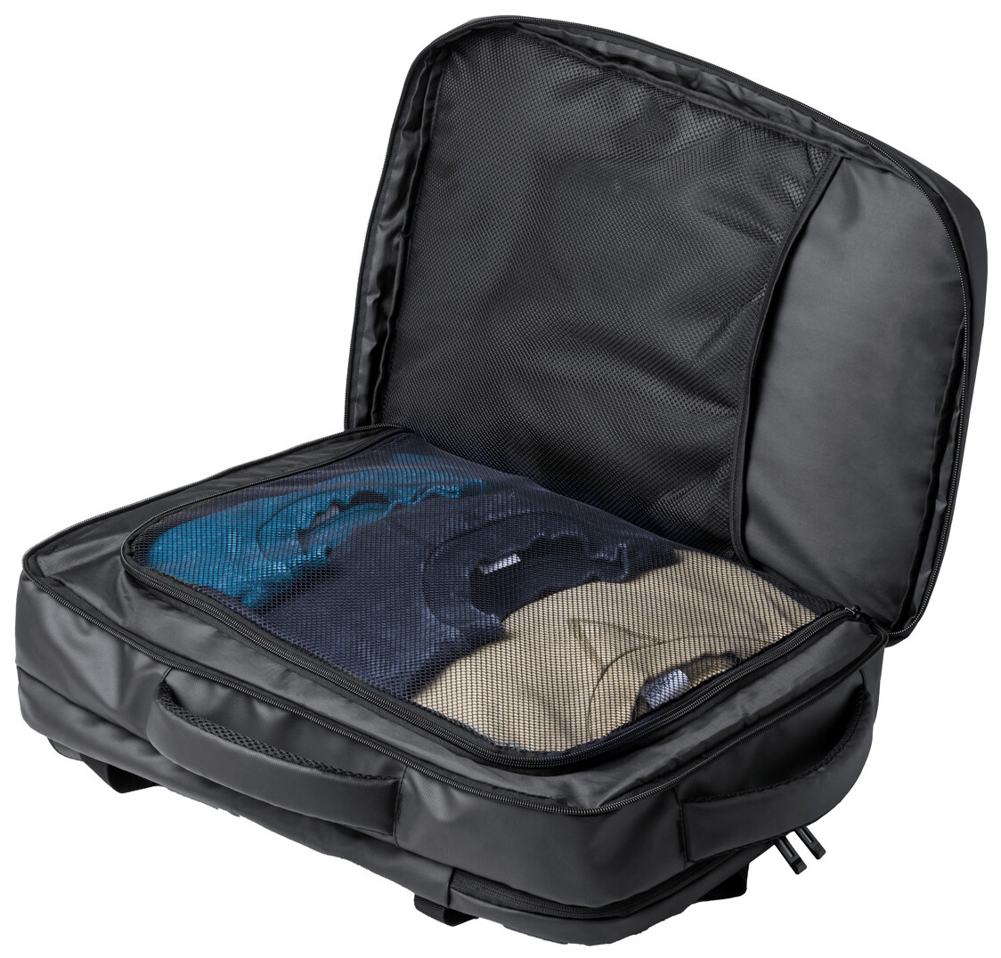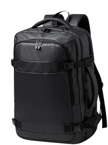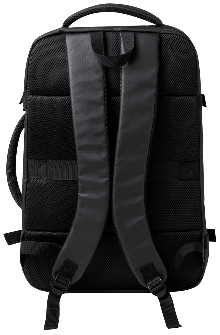 Dvoufunkční batoh a taška na dokumenty z PU kůže s přihrádkami na zip, polstrovanou přihrádkou na notebook (17") a síťovanou přihrádkou, popruhem na vozík, polstrovanými zády a ramenními popruhy.