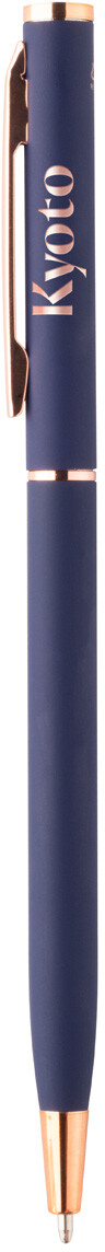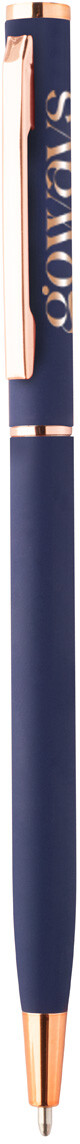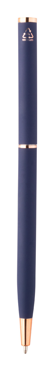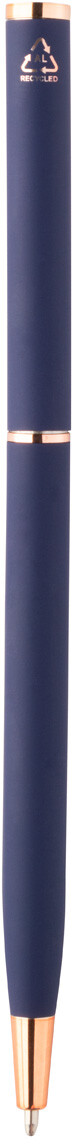 Kuličkové pero z recyklovaného hliníku s pogumovaným povrchem a detaily z růžového zlata. Se speciální povrchovou úpravou pro zrcadlové laserové gravírování v barvě růžového zlata. S modrou náplní.