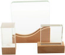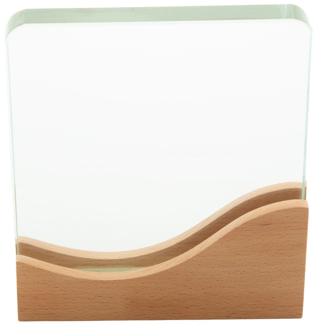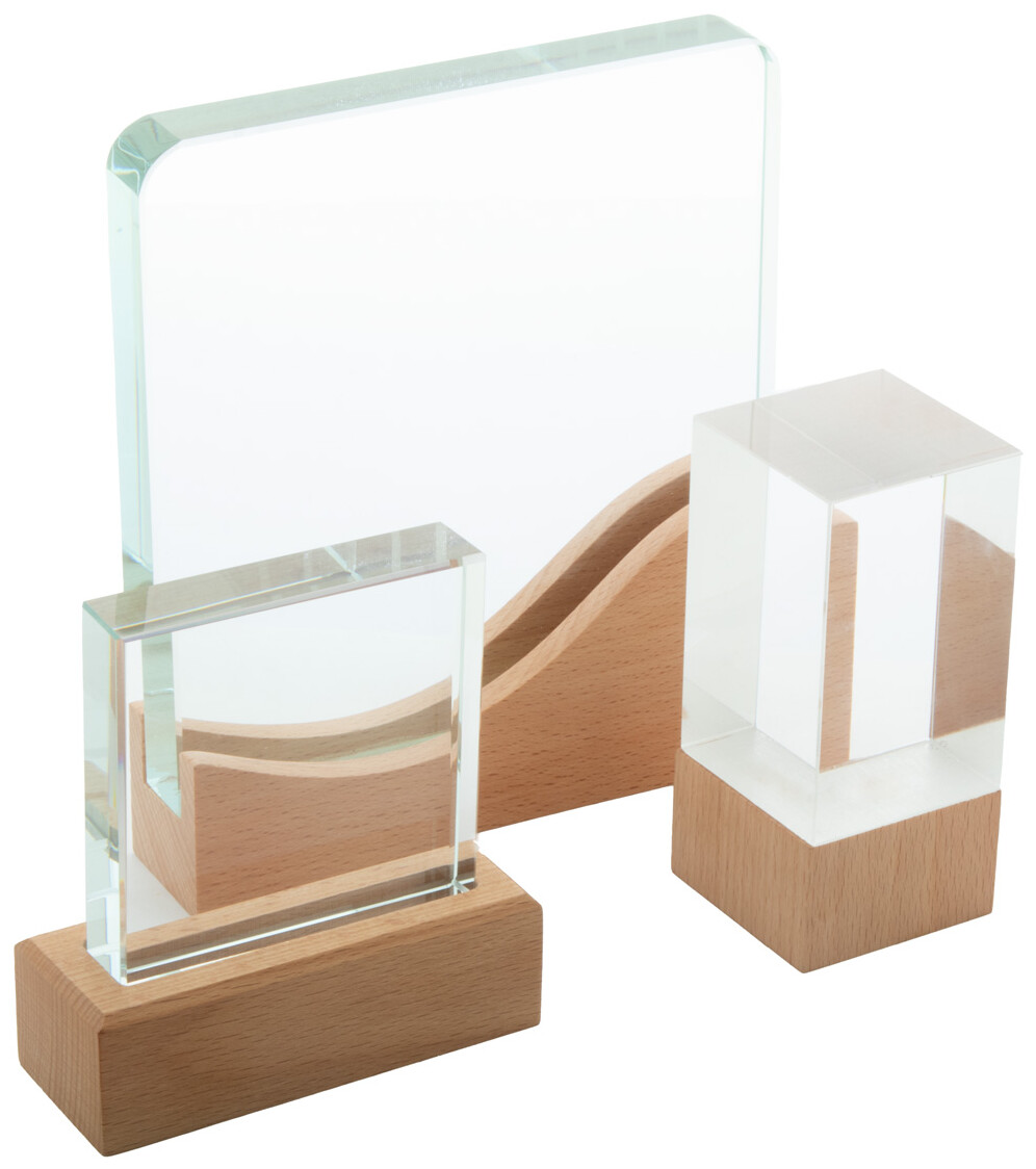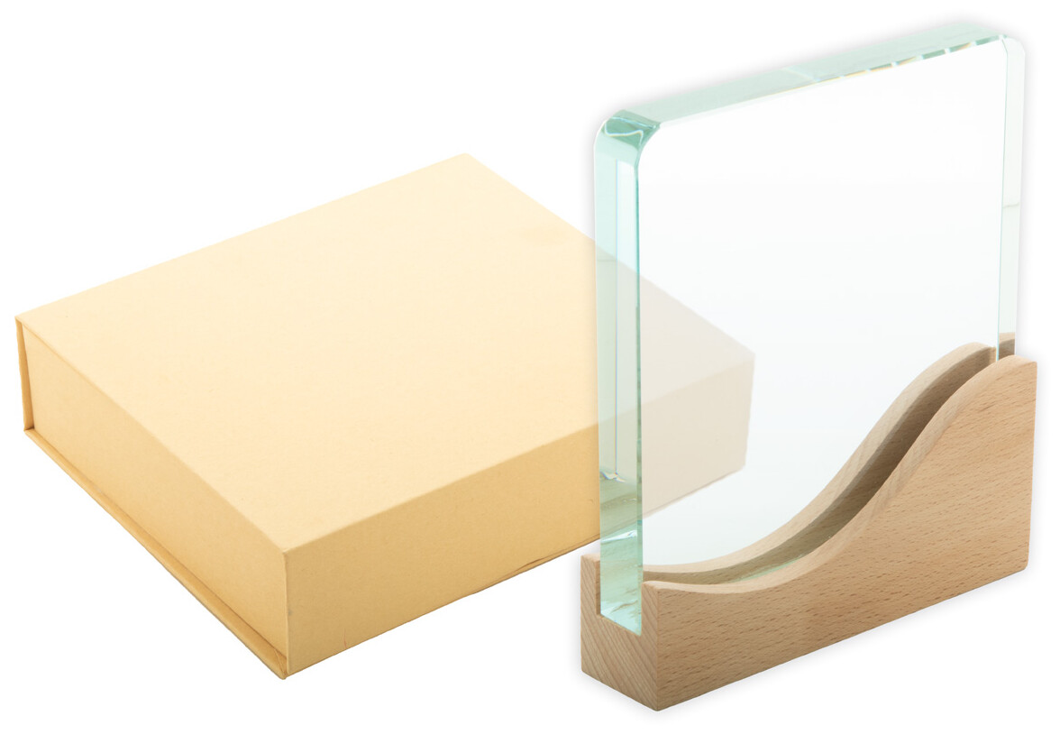 Skleněná trofej s podnoží z bukového dřeva. V kraftové dárkové krabičce.