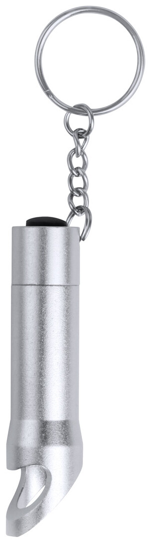 Mini hliníková baterka s 3 LED diodami, otvírákem na láhve a přívěškem na klíče. Dodáváno s knoflíkovou baterií.